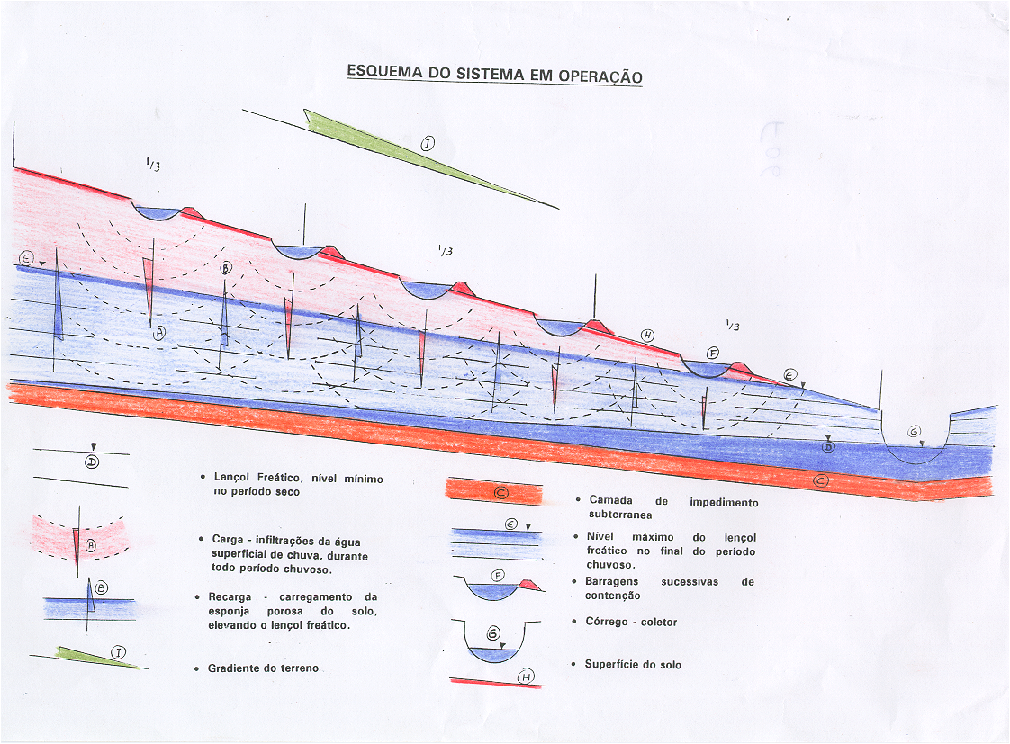 Em todo o centro-norte brasileiro, predominam solos porosos e profundos, os quais, sob barragens, funcionam como uma esponja armazenadora de água filtrada, sob chuvas de 1000 a 1600 mm ano. O objetivo principal do sistema consiste em carregar e descarregar o lago, proporcionando a infiltração da água num rápido espaço de tempo entre uma chuva e outra, de modo que ocorram inúmeras recargas durante o ciclo chuvoso, elevando o lençol freático, carregando a caixa d'água natural do solo.